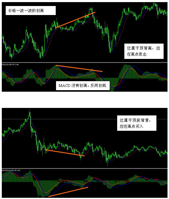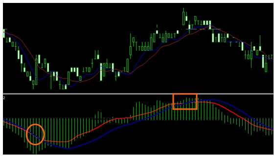当局快线和慢线均在零轴下方时,可以认为市场上空方占据优势。这时快线从下向上突破慢线是买入信号,称为:“金叉”;如果快线从上向下跌穿过慢线是卖出信号,称为“死叉”,则应该认为市场开始回落,投资者应该及时获利了结。