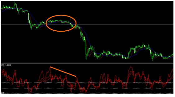 如图所示,在汇价盘整时期,与之对应的RSI 却形成逐步下跌的趋势,根据RSI 指标的领先含义,可以判断汇价在后市会有一个下跌的过程。