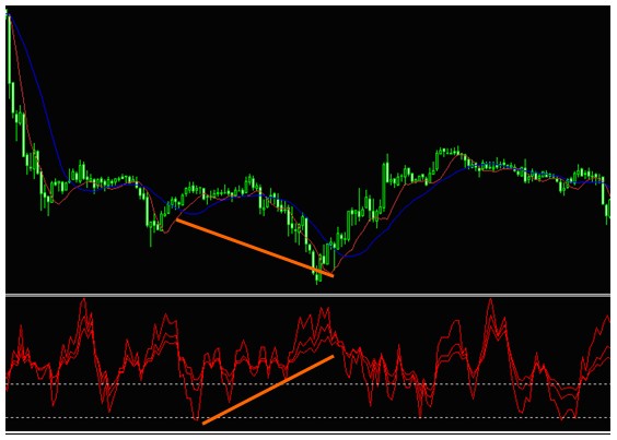 如图所示,在汇价盘整时期,RSI 曲线上接连出现了三个谷底,形成三重底形态,由此判断,汇价将突破上扬。